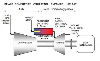 - De lucht die wordt aangezogen en gecomprimeerd, wordt maar voor circa één vierde deel voor de verbranding gebruikt. De rest van de lucht wordt door deze verbranding verhit. Bij het verlaten van de verbrandingskamer bevat het mengsel van lucht en verbrandingsgassen nog 15 à 16% zuurstof. Vergelijk dit met bijv. het dieselproces, waar bijna alle aangezogen lucht voor de verbranding gebruikt wordt.