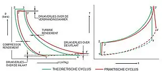 Als samenvatting van het voorafgaande toont de figuur de vorm van het praktische p-V- en T-s-diagram ( 1' - 2' - 3' - 4') ten opzichte van de theoretische braytoncyclus (1 - 2 - 3 - 4). De volgende verschillen (verliezen) treden op tussen het theoretische proces en het werkelijke proces: