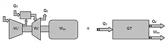De arbeid aan de as is echter ook gelijk aan het verschil tussen de toegevoerde warmte Q1 (brandstof) en de afgevoerde warmte Q2 (uitlaat). Dus: