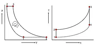 - De expansie van de lucht (3 naar 4 in het diagram) gaat door totdat de atmosferische druk is bereikt. Bij een verbrandingsmotor wordt de expansie eerder afgebroken, omdat voor de afvoer van de verbrandingsgassen via poorten of kleppen een zekere overdruk nodig is.