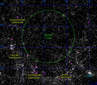 Vlak naast het Gat van Boötes ligt onder meer het Hercules Supercluster. Hiermee wordt bewezen dat het heelal zich continu uitbreidt, waarbij onwillekeurig het ene stuk ruimte anders wordt beïnvloed dan het andere. Sterren en sterrenstelsels klonteren in de loop van miljarden jaren samen en vormen een geheel, zoals het Hercules Supercluster, en ‘trekken’ andere gebieden leeg, waardoor enorme superholtes ontstaan zoals het Gat van Boötes.