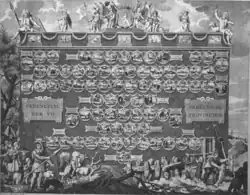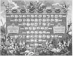 De eerste plaat is bovenaan versierd met de wapens van de provinciën en vertoont, in acht rijen van medaillons de stadsgezichten van 57 stemhebbende steden uit de Republiek der Zeven Verenigde Nederlanden met hun wapens.