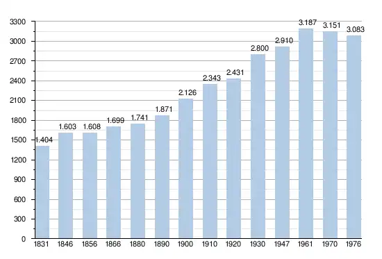 - Bronnen:NIS, Opm:1831 tot en met 1970=volkstellingen; 1976 = inwonertal op 31 december