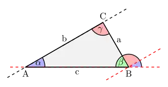 Een driehoek is een meetkundige figuur die bestaat uit drie punten die niet op een rechte lijn liggen, en de lijnstukken die die punten met elkaar verbinden. De lijnstukken heten de zijden van de driehoek; de punten zijn de hoekpunten van de driehoek. De driehoek met de hoekpunten , en wordt genoteerd als . Meestal worden voor een willekeurige driehoek de hoekpunten zo gekozen als in de figuur: links het hoekpunt , rechts en in de top . De grootte van de hoeken van de driehoek wordt meestal overeenkomstig de hoekpunten aangeduid met , en , en de zijden van de driehoek met de letters , en , zodat de tegenover liggende zijde is, tegenover ligt en tegenover .