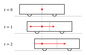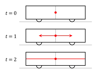 De relativiteit van gelijktijdigheid blijkt in een gedachte-experiment van een rijdende trein met in het midden van een wagon een lamp die een lichtflits afgeeft. Uit de speciale relativiteitstheorie volgt dat licht zich in elk inertiaalstelsel en in alle richtingen voortplant met een eindige, gelijke snelheid, de lichtsnelheid. In het inertiaalstelsel waarin de trein stilstaat, bereikt het licht de voorkant en de achterkant van de wagon gelijktijdig. In het inertiaalstelsel van de buitenwereld komt de achterkant van de wagon het licht tegemoet, en moet het licht de voorkant inhalen. Het licht bereikt in het inertiaalstelsel van de buitenwereld daardoor eerst de achterkant van de wagon en pas later de voorkant, dus niet gelijktijdig.
