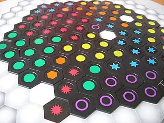 Iedere speler begint met zes tegels en mag in zijn beurt een van deze zes tegels plaatsen. Afhankelijk van het aantal spelers mogen de buitenste of de buitenste twee vakjes niet gebruikt worden. Het scoren gaat als volgt: een van de twee symbolen op de gespeelde tegel wordt gekozen. Vanaf dit symbool zou men 5 lijnen kunnen trekken. Langs elke lijn telt men nu het aantal identieke kleuren op andere tegels, totdat men een leeg veld of een veld met een ander symbool tegenkomt. De totale score in een kleur bestaat uit de optelsom van de score uit de 5 rijen. Op dezelfde wijze bepaalt men de score van het andere symbool op de gespeelde tegel. Aan het einde van de beurt vult de speler z'n bordje weer aan tot zes tegels.