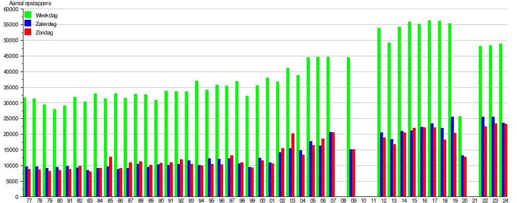 - ↑ De bron voor de gegevens zijn de jaarlijks door de NMBS in oktober uitgevoerde reizigerstellingen. Stationspersoneel en treinbegeleiders tellen dan visueel gedurende negen opeenvolgende dagen (vijf werkdagen en de twee aansluitende weekends) in alle stations en stopplaatsen het aantal instappende reizigers en dit voor alle binnenlandse treinen. De groene balk geeft het gemiddeld aantal opstappende (dus niet het aantal afstappende) reizigers weer op een weekdag (maandag, dinsdag, woensdag, donderdag en vrijdag opgeteld en gedeeld door vijf). Zaterdag wordt weergegeven door de blauwe en zondag door de rode balk. De cijfers geven een indicatie en hebben een foutenmarge, die in sommige gevallen aanzienlijk kan zijn. In 2008, 2010, 2011 en 2021 (corona) werden geen tellingen uitgevoerd. De gegevens zijn online raadpleegbaar, zoekterm Reizigerstellingen