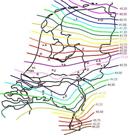 - het relatief hoogteverschil tussen de geoïde en de ellipsoïde (plaatsgebonden correctiefactor)
