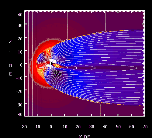 In de bovenste delen van de aardatmosfeer wordt de zonnewind –de van de Zon afkomende stroom geïoniseerde deeltjes– afgebogen. Tegelijkertijd wordt het veld zelf sterk vervormd door de botsing met de zonnewind. De plek waar de botsing tussen de zonnewind en het aardmagnetisch veld plaatsvindt wordt de magnetopauze genoemd, de zone binnen de magnetopauze is de magnetosfeer.