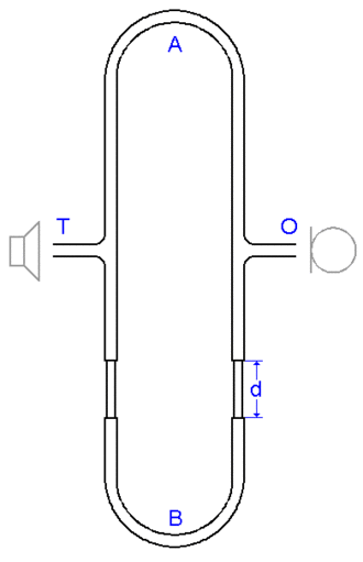 Bij dit experiment wordt gebruikgemaakt van een rondlopende buis met een vast deel A en een uitschuifbaar deel B. Op één punt (T) wordt een bepaalde toon toegevoerd en op een ander punt (O) wordt geluisterd. De lengte van buis B wordt dan zodanig gevarieerd (d) dat er in het punt O door de optredende interferentie een minimum aan geluid te horen is. De geluidsgolven die via elk van de buizen bij O aankomen, hebben dan een tegengestelde fase en heffen elkaar dus op. Aan de hand hiervan kan, door het verschil in lengte van de buisdelen A en B te meten, de golflengte van de toegevoerde geluidsgolf worden bepaald.
