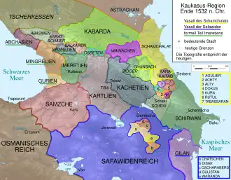 In de 16e eeuw werden Georgische koninkrijken en hertogdommen door zowel het Ottomaanse Rijk als Safavidisch Perzië bevochten. Met de Vrede van Amasya in 1555 werden Kartlië, Kachetië en Oost-Samtsche aan Perzië toebedeeld en kregen de Ottomanen de controle over de Georgische vorstendommen Abchazië, Mingrelië, Goeria, west-Samtsche en het koninkrijk Imeretië. Het vorstendom Svanetië diep in de Grote Kaukasus werd ook aan de Ottomanen toegewezen, maar ze oefenden er feitelijk geen macht over uit. In de 17e eeuw hielden de Perzen geregeld huis in Kartlië en Kachetië en verstevigden hun macht. Onder het bewind van Vachtang VI (1716-1724) kwam er herstel en economische voorspoed in Kartlië. Rusland deed zijn entree in Transkaukasië toen Vachtang VI zich aansloot bij de Perzische campagne van tsaar Peter de Grote, waarmee Perzen tijdelijk uit de Georgische landen verdreven werden.