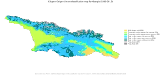 Door de grote hoogteverschillen in het land, van zeeniveau tot hoge bergtoppen in de nivale zone, heeft Georgië een significante klimatologische variatie. In het westelijke deel van Georgië is het klimaat subtropisch, terwijl in het oostelijke deel een landklimaat heerst, met in het uiterste zuidoosten een steppeklimaat.[41] Hoofdstad Tbilisi is in de zomer erg warm, terwijl de kuststreek van de autonome republiek Adzjarië, in het zuidwesten van het land, wordt gekenmerkt door een zeer vochtig klimaat.[42] De jaarlijkse neerslag in Georgië varieert van 400 tot 4.500 mm. De Adzjaarse hoofdstad Batoemi, gelegen aan de Zwarte Zee, heeft een gemiddelde neerslag van ruim 2100 mm per jaar.[43] Het aantal uren zonneschijn varieert van 1.350 tot 2.520 uur.