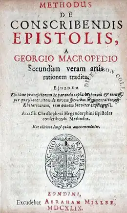 Een leerboek voor het schrijven van brieven. Aan de orde komen onder andere: soorten brieven, adressering, titulatuur, aanhef en einde, volgorde van onderwerpen in de brief, inkleding, stijl van schrijven en stijlfiguren. Dit werk vormde een belangrijk onderdeel van het gehele onderricht, dat gericht was op een actieve beheersing van het Latijn. Het boek is vele malen herdrukt met verschillende aanhangsels, veelal onder de titel Methodus de Conscribendis Epistolis.[49] - Hymni et Sequentiae (1552)