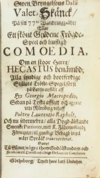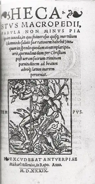 Een bewerking in humanistische geest van het Middelnederlandse Elckerlijc. Hecastus, een levensgenieter, hoort van een boodschapper van God dat hij diezelfde dag gaat sterven. Hij gaat tevergeefs op zoek naar iemand die voor hem wil pleiten als hij zich voor God moet verantwoorden. Nadat hij door familie en vrienden in de steek is gelaten, wordt zijn uiteindelijke redding bewerkt door de allegorische personages Fides (Geloof) en Virtus (Deugd).[58] - Lazarus Mendicus (1541)