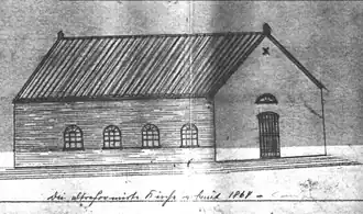 De gemeente van Campen was de eerste gereformeerde gemeente van Oost-Friesland en heeft haar ontstaan in het jaar 1854 te danken aan de leek Heye Gossen Heikens (1806–1884). Heikens begon in 1848 voor het eerst te preken en baarde met zijn catechistische geschriften in 1851 opzien, waarvan gedrukte exemplaren werden verspreid. Er kwamen steeds meer mensen op zijn samenkomsten af en al snel werd de privéruimte waarin deze bijeenkomsten plaatsvonden te klein. Om meer ruimte te scheppen werd in 1866 een eerste kerk gebouwd. Op een schets van deze gereformeerde kerk uit het bouwjaar is een eenvoudig zaalkerkje met een zadeldak en vier rondboogramen in de lengtemuren te zien.