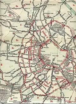 - ’’Durchgangslinien’’: een combinatie van een (deel van een) radiale met een tangentiale lijn. Voorbeeld: lijn J rijdt over de route van de lijnen 45, 1 en 75.