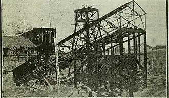 Bovengrondse gedeelte van de No. 2 Mine met ernaast een enorme hoop gedolven erts (begin 20e eeuw). 's Winters werden zulke hopen aangelegd aangezien de scheepvaart toen stillag.[30] -