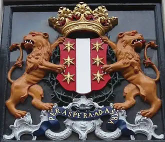 Van keel, beladen met eenen pal van zilver, en verzeld, ter werdzijde van drie zespuntige sterren van goud, staande in den zin van den pal. Het schild gedekt met eene kroon met vijf fleurons, alles van goud, en omgeven van eene doornenkrans. Voorts vastgehouden door twee klimmende leeuwen in hunne natuurlijke verwen en onder hetzelve het oude motto 'Per aspera ad astra'.