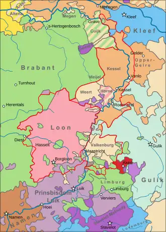 - Het graafschap Loon (nu Belgisch Limburg), dat net als het graafschap Horn (nu grotendeels in Nederlands Limburg), onderdeel was van het prinsbisdom Luik