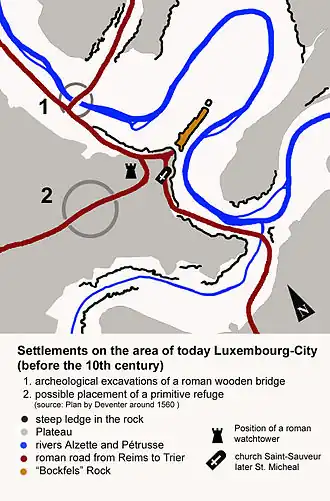 Tijdens het Romeinse tijdperk bestond er een houten brug over de Alzette, alsook een grote wachttoren die uitkeek over de verbindingsweg tussen de twee belangrijkste steden van Belgica: Reims en Trier. De Romeinse plaatsnaam van Luxemburg is onbekend.[1]