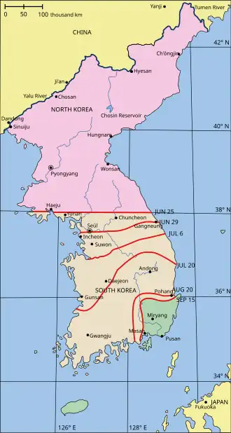 De aanvallende Chinezen drongen de westerse coalitie terug tot de 38e breedtegraad, die tot op de dag van vandaag de grens tussen Noord- en Zuid-Korea vormt. Douglas MacArthur werd op 11 april 1951 ontheven uit zijn functie als bevelhebber over de VN-troepen in Korea. Hij had namelijk controversiële verklaringen afgelegd over een mogelijke uitbreiding van de oorlog tot in China en over mogelijk gebruik van kernwapens op tactische doelen in China. Generaal MacArthur vroeg de Amerikaanse president Harry Truman toestemming om atoombommen op China te gooien, maar die weigerde dit uit vrees voor een nucleaire oorlog. Noord-Korea en China hadden dan wel geen beschikking over kernwapens, maar ze werden gesteund door de Sovjet-Unie.