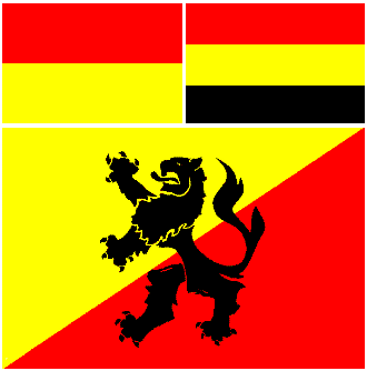 Drie horizontale banen van gelijke hoogte en gelijke lengte, van boven naar beneden rood, goud en zwart