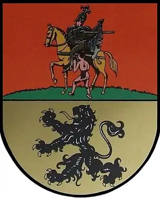 Doorsneden: boven in keel St.Maarten, gedekt met een gepluimden helm en gekleed met een wapenrok en brodekijnen, alles van goud, en gehuld in een mantel van zilver; gezeten op een paard van natuurlijke kleur, met toom en dekriemen van goud, gaande over een grasgrond van sinopel, met een zilveren zwaard in de rechterhand snijdt hij een stuk van zijn mantel af hetwelk hij geeft aan een nevens het paard staanden naakten bedelaar van natuurlijke kleur, de lendenen omgord met een tasch en gordel van sabel; onder in goud een leeuw van sabel, getongd en genageld van keel (Gulik).[56]