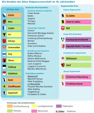 Zwitserland kreeg de al lang bereikte autonomie volkenrechtelijk bevestigd in de Vrede van Westfalen op 24 oktober 1648, die ook een einde maakte aan de Tachtigjarige Oorlog en de Dertigjarige Oorlog. Nog twee keer zou het in Zwitserland tot korte godsdienstoorlogen komen: de Eerste Villmergeroorlog (1656), die de katholieke dominantie bevestigde, en de Toggenburgeroorlog oftewel Tweede Villmergeroorlog (1712), die de protestantse kantons dominant maakte. De verhoudingen tussen de kantons was zeer ongelijkwaardig: er waren de Dreizehn Alte Orte, 13 volwaardige kantons (Appenzell, Basel, Bern, Fribourg, Glarus, Luzern, Schaffhausen, Schwyz, Solothurn, Unterwalden, Uri, Zug en Zürich) die macht uitoefenden over veroverde gebieden (Untertanenländer zoals Aargau, Thurgau en Vaud), (gezamenlijk) beheerde gebieden (Vogteie) of bondgenoten (zoals Neuchâtel, Wallis en Graubünden).