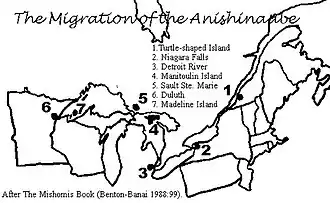 Na lange omzwervingen, waarbij men iedere keer dat een miigis uit het zand of uit het water opsteeg, wist dat op die plaats een nieuwe kolonie moest komen, kwamen de Anishinaabeg – zoals de Algonkin zich intussen waren gaan noemen – terecht in het Grote Merengebied. Bij het huidige Detroit (nr. 44) (of, volgens andere bronnen, bij Sault Ste. Marie, nr. 1) splitsten ze zich op in 6 hoofdgroepen: de Ojibweg, de Bodéwadmik, de Odaawaag, Misi-zaagiwininiwag (Mississauga), Omàmiwininiwak (Algonkin ) en N’biising (Nipissing); tevens werd, volgens sommige bronnen bij het huidige Detroit (nr. 44) en volgens andere bronnen het huidige eiland Mackinac (nr. 4 ), een machtig politieke "drievurenverbond" tussen de eerste drie groepen gevormd. Wanneer precies de migranten in het Grote Merengebied terechtkwame,n is overigens onbekend. Sommige bronnen die zich baseren op de mnemonische geschriften op de berkenbasten rollen van de Midewiwin, spreken van de 8e of 9e eeuw n.Chr.[4] Maar er zijn ook bronnen die een andere interpretatie van de oude geschriften geven, en de aankomst van de Anishinaabe-migranten in de 15e of 16e eeuw plaatsen.[5]