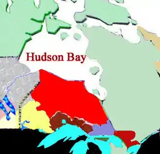- Gemarmerd grijs: Treaty # 5 tussen koningin Victoria en de Nakawē-Ojibweg en de Swampy Cree, 1875, Oost-Saskatchewan, Centraal- en Noord-Manitoba en West-Ontario.