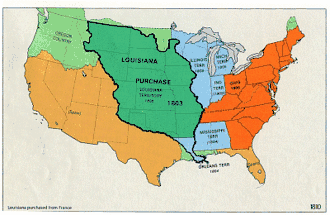 Jefferson geloofde dat uitbreiding naar het westen toe belangrijk was voor de ontwikkeling van de Verenigde Staten. Hij stuurde gezanten naar Parijs om te onderhandelen over de aankoop van de stad New Orleans, een belangrijke stad aan de monding van de Mississippi. De onderhandelingen mislukten aanvankelijk en Jefferson stuurde de latere president James Monroe naar Parijs om de onderhandelingen vlot te trekken. Uiteindelijk verbaasde Napoleon de Amerikaanse delegatie door het gehele gebied Louisiana te koop aan te bieden. Frankrijk probeerde zo te voorkomen dat dat goeddeels nog onverkende gebied in Britse handen zou vallen en een sterkere VS zouden tegenwicht bieden tegen het Britse kolonialisme in Noord-Amerika. Hoewel zij geen instructies hadden om hierover te beslissen, zagen zij het belang van het aanbod in en gingen de onderhandelaars van Jefferson akkoord met de Louisiana Purchase. De prijs; $15 miljoen oftewel $7 per km². In 1803 overhandigde Frankrijk Louisiana aan de VS, een gebied dat grote delen van het midden van het Noord-Amerikaanse continent besloeg. De VS werden daarmee meer dan twee keer zo groot.