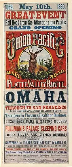 Na de Burgeroorlog werden de oost- en westkust van het Noord-Amerikaanse continent door middel van de Transcontinentale Spoorweg met elkaar verbonden. Het idee voor deze spoorlijn had zijn oorsprong lang voor de oorlog maar het conflict bracht het belang ervan naar voren. In 1862 werd de Pacific Railway Act aangenomen die de lijn formeel autoriseerde en begonnen de Union Pacific Railroad en de Central Pacific Railroad met de aanleg ervan. De twee spoorlijnen ontmoetten elkaar in Utah waar op 10 mei 1869 de ceremoniële gouden spijker in de grond werd geslagen nabij Promontory Point. Tot 1872 moesten treinen nog wel per veerboot de Missouri oversteken maar dit werd overbodig na opening in dat jaar van een spoorbrug over de rivier. Met de voltooiing van de spoorlijn werd de tijd die nodig was om over land van New York naar San Francisco te reizen van meerdere maanden gereduceerd tot één week.