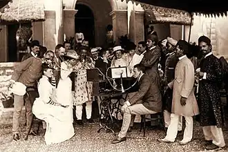 - [...] the recorder places his artiste a few inches in front of the horn. Immediately behind and around are the musicians, arranged as the recorder may desire. In all cases the reed instruments are nearer to the horn than the brass. All instruments have to be carefully focussed to the mouth of the horn, otherwise the result would not be properly balanced. The orchestra now play the introduction, during which the artiste leans away in order to enable the bandsmen to play right into the horn without the vocalist's head obstructing [...][11]