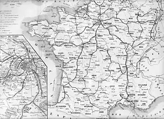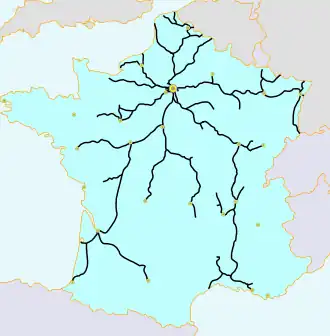 Op 11 juni 1842 wordt een wet aangenomen voor bouw van een landelijk spoornet, op basis van de 'ster van Legrand'. Vanuit Parijs worden hoofdspoorlijnen voorzien naar: