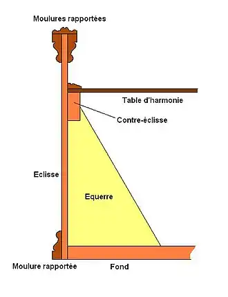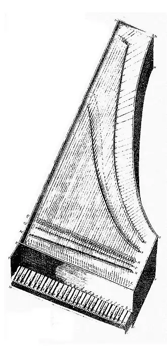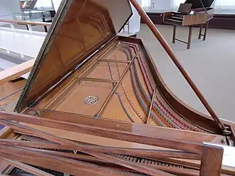 - de moderne kast in stevig hout en open naar beneden, versterkt door een massieve interne structuur en door een metalen kader, van uitzicht méér gebald had niet tot doel bij te dragen tot de klank, maar een perfecte en stabiele spanning van de snaren te bereiken. Hanns Neupert schreef hierover: