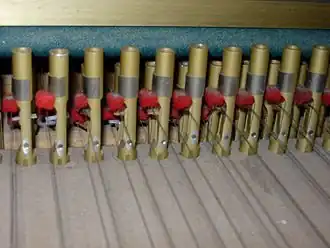- De moderne snaren hadden een lang module, soms méér dan 40 cm. Ze volgden dus de juiste pythagorische proportie niet en, teneinde hun forse spanning te compenseren, moesten ze hard gefileerd worden, zeker voor de lage tonen, en meer bepaald voor het spel met 16 voet, die vaak de kam deelde met het spel van 8 voet. De traditionele snaren daarentegen, met hun veel kortere module van minder dan 35 cm lieten de juiste proporties toe naar de hoge tonen en waren fijn en zwak gespannen. Als het spel van 16 voet er bestond werd het met een afzonderlijke kam bediend.