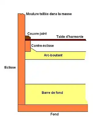 - Het moderne klavecimbel heeft een nogal zware harmonietafel (méér dan 5 à 6 mm) met een belangrijk balkensysteem. De harmonietafel is niet vaak gedecoreerd maar eerder gevernist. Wat de traditionele harmonietafel betreft ze was nooit dikker dan 3 mm, met een minimum aan balken en vaak met bloemenmotieven versierd.