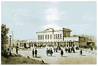Perron van de Nederlandsche Rhijnspoorweg-Maatschappij in 1866, later het Centraal Station. -