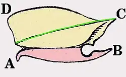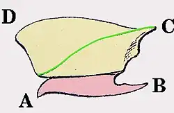 | geel: Halsschild; rood: Voorste borststuk groen: Rand van de halsschildkant A: Voorste rand van het voorste borststuk B: Tand aan achtereinde van het voorste borststuk C: Achterhoek van het halsschild D: Voorste rand van het halsschild | |