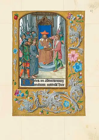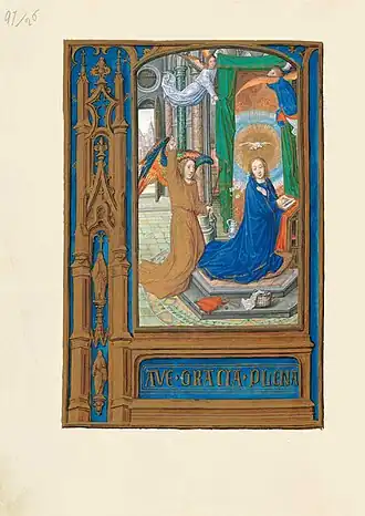 - ↑ a b Zo goed als identiek aan de miniatuur in het Rothschild-getijdenboek.