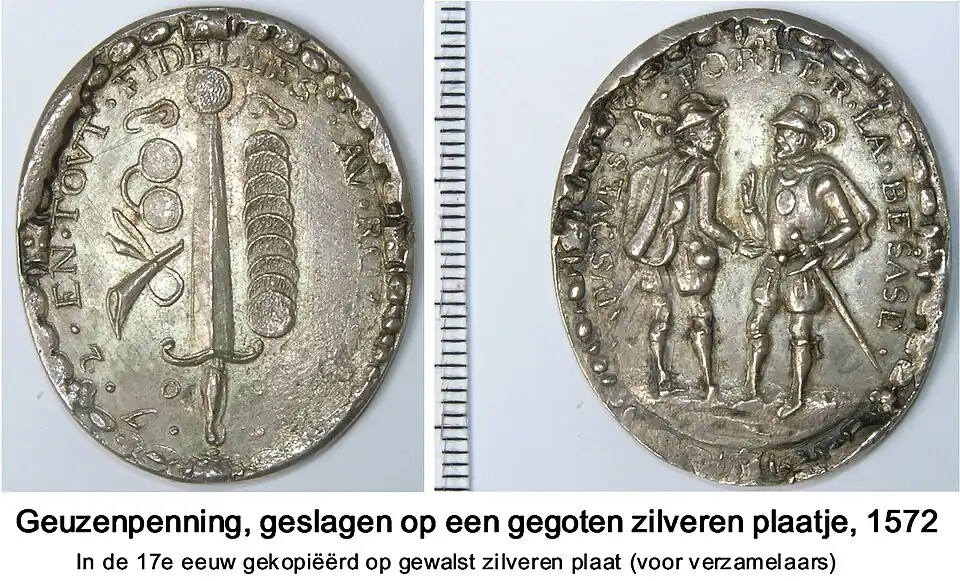 Uit correspondentie tussen Granvelle (in Madrid) en zijn secretaris Morillon (in Brussel) blijkt dat de medailleur Jacques Jonghelinck, protegé van Granvelle, in één der bijgebouwen van het hof in het voorjaar van 1566 een kleine draagpenning in versies van lood, tin, koper, zilver of goud heeft gegoten (versies in koper of tin zijn nu onbekend, een enkel exemplaar in lood komt voor, maar omdat lood zacht is, is het moeilijk om na zoveel eeuwen vast te stellen of het een origineel is of – veel waarschijnlijker – een latere kopie). Op 15 juni stuurde Morillon een loden exemplaar aan Granvelle met de sneer dat er meer in lood worden gemaakt dan in de andere metalen, bovendien was hij kennelijk bedoeld voor armelui, want affin peult-estre que les Geutz demeurent en leur qualité, zoiets als misschien om de penningkwaliteit voor Geuzen gepast te houden. Een dergelijke penning in verguld zilver is hieronder afgebeeld.