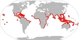 | Verspreidingsgebied van de gevlekte adelaarsroggen (A. narinari, A. laticeps en A. ocellatus) | |||||||||||||||
