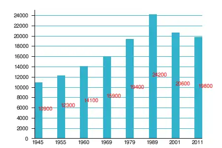 De stad telt 28.673 inwoners (2011), een cijfer dat in de loop der tijd sterk is gestegen (6000 inwoners omstreeks 1880, 11.000 rond 1950, 20.630 in 2001), maar de laatste jaren opnieuw in dalende lijn gaat (van 43.095 inwoners in 2009 naar 29.000 in 2011).[5][6]