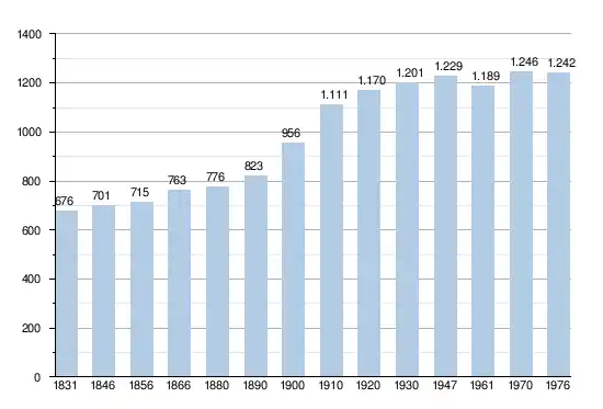 - Bronnen:NIS, Opm:1831 tot en met 1970=volkstellingen; 1976 = inwoneraantal op 31 december