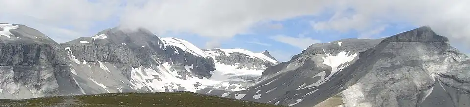 De Tschingelhörner op de grens tussen de kantons Glarus en Graubünden. De Glarner-overschuiving is te zien als een horizontale lijn in de bergwand.
