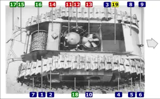 1: Romp 2: Rupsband 3: Ondersteuningswiel 4: Wiel 5: Kettingwiel
