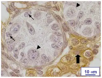 - ↑ Gondos, Bernard, Hobel, Calvin J. (1971). Ultrastructure of germ cell development in the human fetal testis. Zeitschrift für Zellforschung und Mikroskopische Anatomie 119 (1): 1–20. ISSN: 0302-766X. PMID 4327535. DOI: 10.1007/bf00330535.