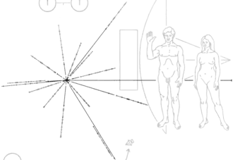 ![]() Het pictogram links op de plaat toont vijftien lijnen die uit dezelfde oorsprong komen. Veertien lijnen zijn opgebouwd uit streepjes die een binair getal voorstellen, die overeenkomen met de frequentie van pulsars. De oorsprong komt overeen met de positie van de zon. De vijftiende lijn die zich uitstrekt tot voorbij de menselijke afbeeldingen, geeft de afstand weer tot het centrum van de Melkweg. Doordat naarmate de tijd verstrijkt ook de frequentie van de pulsars verandert, kan ook de tijd van verzending worden bepaald. |