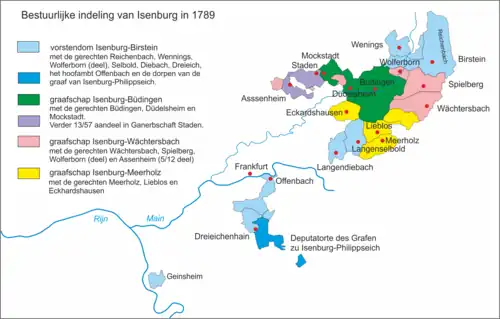 De oudste linie Isenburg-Birstein heeft het zwaartepunt van de bezittingen ten zuiden van de Main in de Dreieich. De jongere linie Isenburg-Büdingen heeft het zwaartepunt van de bezittingen in het oude graafschapsgebied in het Büdinger Rijkswoud.