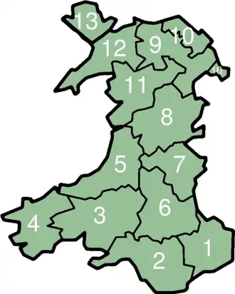 De dertien historische graafschappen van Wales werden in 1535 vastgesteld (hoewel graafschappen als Pembrokeshire van 1138 dateren). De bestuurlijke graafschappen van Wales werden in 1889 op basis hiervan ingesteld. In 1974 werd een nieuw systeem gecreëerd. Dit werd in 1996 weer afgeschaft en sindsdien is Wales opgedeeld in bestuurlijke eenheden die principal areas genoemd worden.